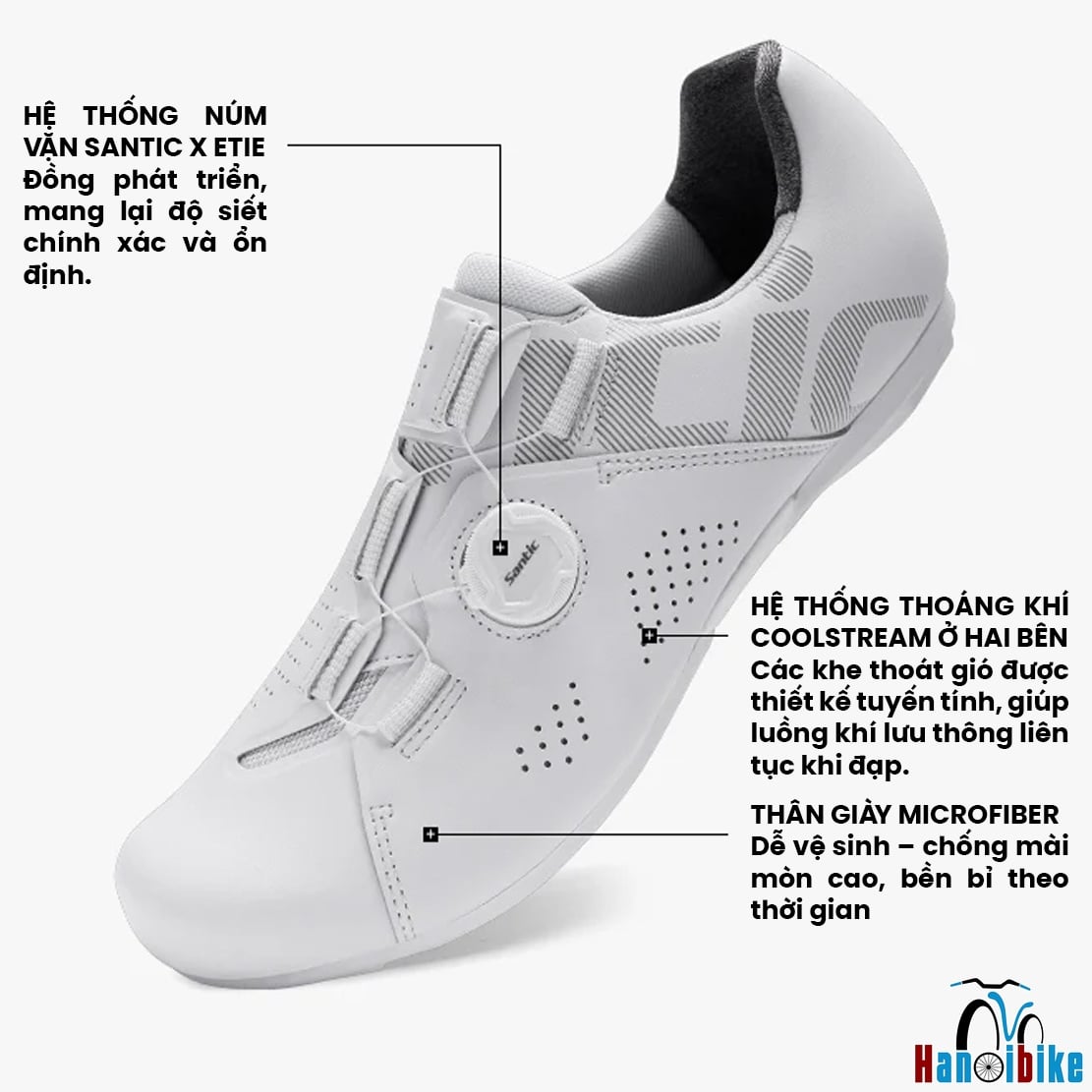 - Hệ thống núm vặn SANTIC X ETIE cho khả năng siết vi chỉnh chính xác, giúp ôm chân ổn định trong suốt quá trình đạp. Bên trong giày là lớp lót Reverse-Scale Inner Lining chống trượt, tăng độ bám và giảm thất thoát năng lượng. Các khe thoáng CoolStream dọc hai bên duy trì luồng khí liên tục, giảm nóng chân khi hoạt động cường độ cao.