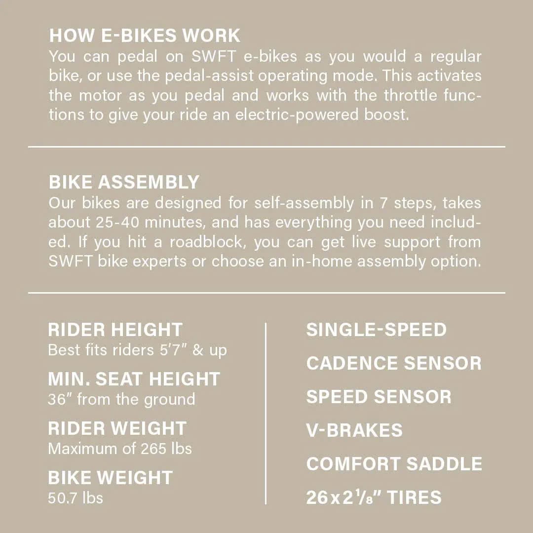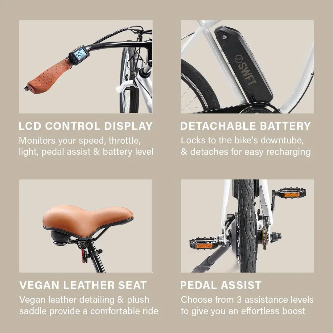 Xe đạp trợ lực điện SWFT E-BIKE là dòng xe đạp điện thương hiệu nổi tiếng của Mỹ. SWFT là một trong các model bán rất chạy của hãng tại thị trường USA, có lượt bán rất tốt trên các nền tảng thương mại điện tử như Ebay, Amazon.,được trang bị nhiều tính năng hiện đại và thiết kế tiên tiến.