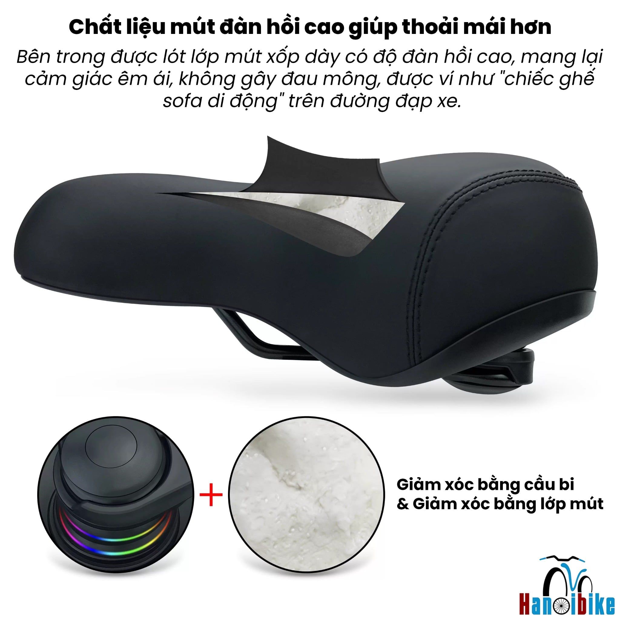 Đệm mút mật độ cao: Yên được lót lớp bọt biển (foam) đàn hồi cao và dày dặn, mang lại cảm giác mềm mại, không bị xẹp lún theo thời gian.
